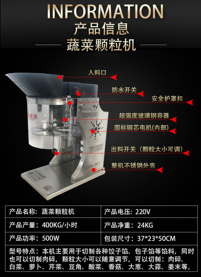 6、功能强大、一机多用、省时省力。整机采用全不锈钢制造,卫生、美观、耐用,变频调速简单直接;